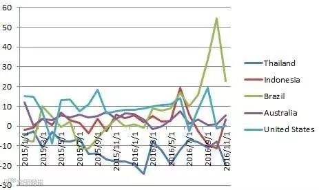图3:2015年1月~2016年11月 百草枯前五大出口国价格指数与全球价格指数的对比(设定值为零)
