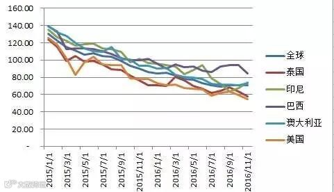 图2:2015年1月~2016年11月 百草枯前五大出口国价格指数