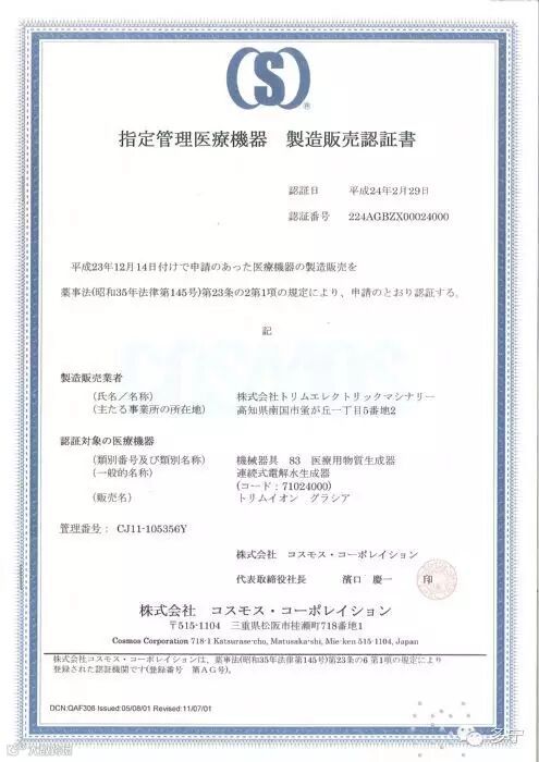 (同款日本规格的水机取得日本家用医疗器械认证)