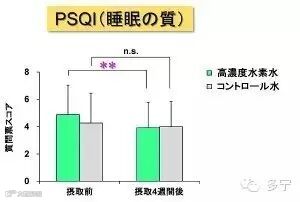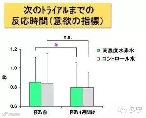 ・根据匹兹堡睡眠问卷调查,摄取水素水4周以后睡眠质量得到显著改善(图1)。使用心电图和脉搏波同时监测装置(疲劳度仪)评价自律神经功能,交感神经活动指标(LF)仅在摄取高浓度水素水这一组中,摄取前后对比有明显降低(图2)。进一步在认知功能检查中,让两组人员交叉找出显示屏呈现的数值与平假名书写的25个文字时,反映作业欲望的每次回答之间的反应速度仅在摄取高浓度水素水这一组身上,在摄取前后有明显的提高(图3)。这表示该组人员的挑战欲望高。