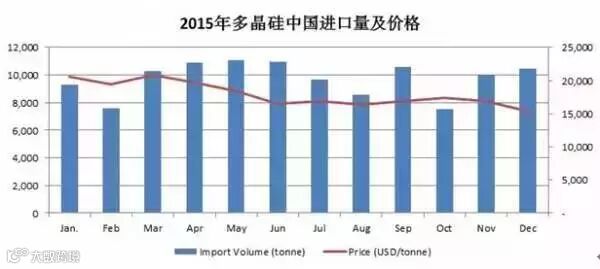 2015年国内外光伏市场持续升温,多晶硅受益与光伏产业的发展,中国进口量虽在年中受政策影响,有较大波动,但纵观全年进口量来看,仍然保持强劲进口形势。全年多月进口量超万吨。但由于太阳能板供给出现过剩,进口价格持续下跌。
