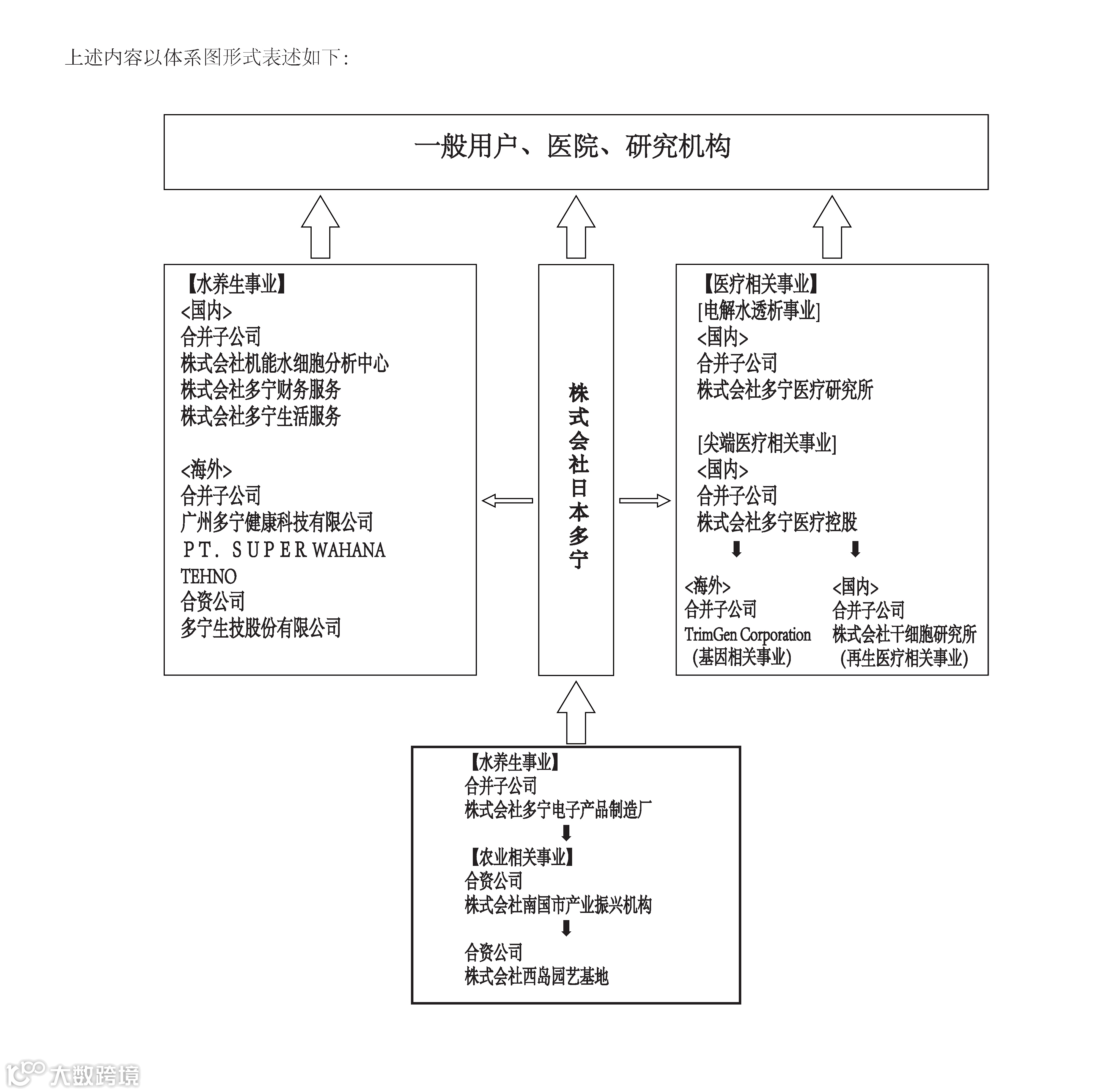 本集团(本公司及关联企业)包括以下14家公司:本公司(株式会社日本多宁)、合并子公司株式会社多宁电子产品制造厂、株式会社多宁医疗控股、TrimGen Corporation、株式会社机能水细胞分析中心、株式会社多宁财务服务、广州多宁健康科技有限公司、株式会社多宁医疗研究所、株式会社多宁生活服务、PT.SUPER WAHANA TEHNO、株式会社干细胞研究所以及合资企业的台湾多宁生技股份有限公司、株式会社南国市产业振兴机构、株式会社西岛园艺基地。