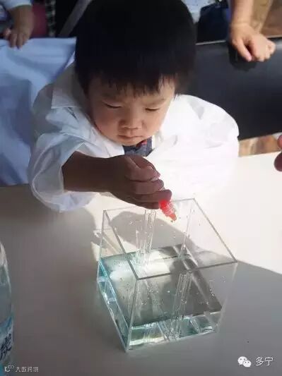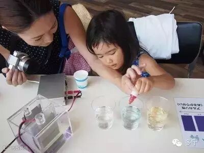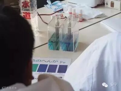 使用检测水的酸碱性的试剂,让孩子们亲眼目睹各种水的差异。他们津津有味地观看同样透明的杯子里的水分别变成不同的颜色时的样子,十分可爱。