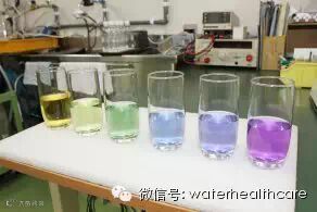 向电解水机生成的水中滴入试剂,颜色就变化啦!最左边的呈酸性,左起第三杯水大致呈中性,越往右就碱性越强。