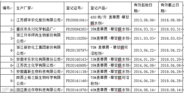 根据药检所的统计数据,截止至2015年5月底,国内已有9家企业共登记了9个麦草畏·草甘膦制剂产品,其中有5个制剂产品是在2014年获得登记的。从产品登记的剂型来看,水剂占了较大的比例。其中麦草畏与草甘膦的水剂复配产品登记数量是7个,大概占了总登记数量的77.78%,其余的两个产品的剂型分别是可溶粒剂和可溶粉剂。目前麦草畏·草甘膦复配制剂产品主要用于防除非耕地杂草,用药量598.5克/公顷-1575克/公顷。江苏辉丰农化股份有限公司是国内首家获得麦草畏·草甘膦复配制剂产品(400克/升麦草畏·草甘膦水剂)登记的企业,登记证号是PD20081041。