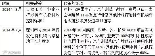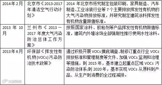 无论是中央政府的环保部门,还是地方各级政府,对于有机物排放的相关政策发布趋于频繁,尤其是经济比较发达的地区,如下表所示。而传统涂料,主要用有机溶剂作为稀释剂,含有大量的挥发性有机化合物VOC。随着挥发性有机物污染治理的进一步推进,明显地,传统涂料的发展将受到限制,与此同时,环保涂料将迎来发展机遇。