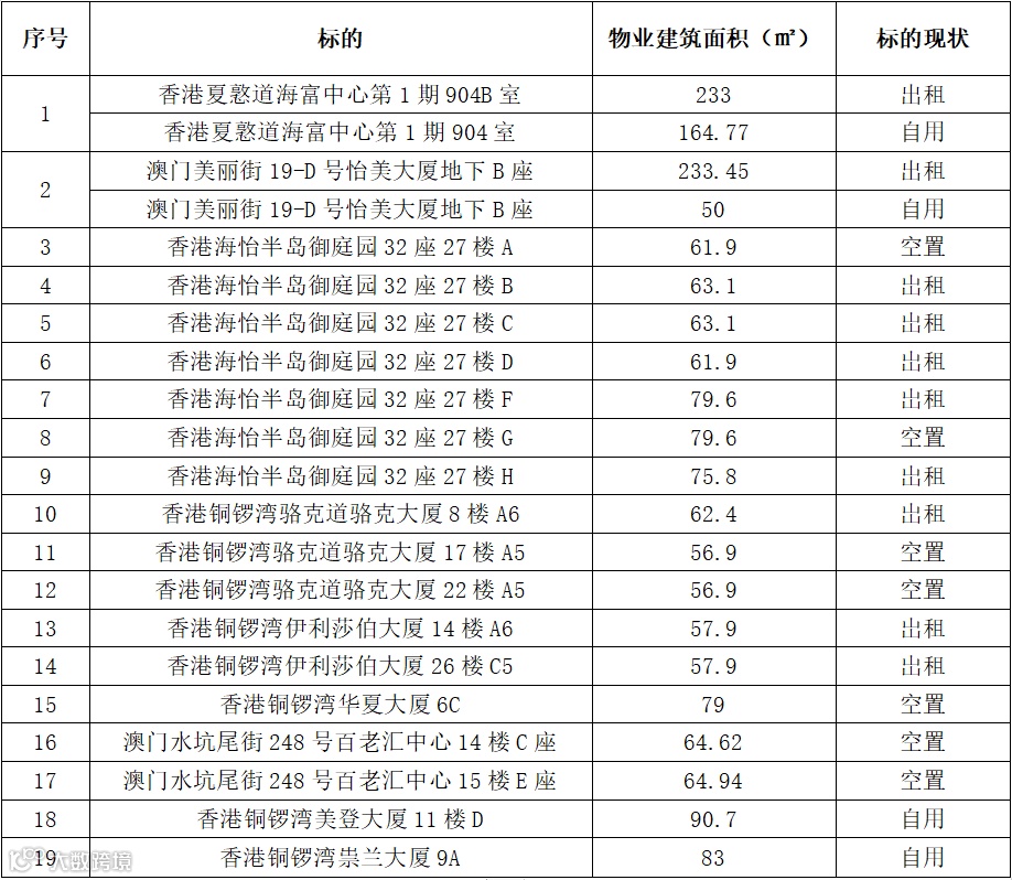 标的分别位于香港海怡半岛御庭园、香港铜锣湾骆克道骆克大厦、香港铜锣湾伊利莎伯大厦、香港铜锣湾华夏大厦、香港铜锣湾美登大厦、香港铜锣湾祟兰大厦、澳门水坑尾街248号百老汇中心、香港夏憝道海富中心第1期、澳门美丽街19-D号怡美大厦。总建筑面积1840.48平方米,均有独立的房地产权资料,均无抵押、查封、异议情况。