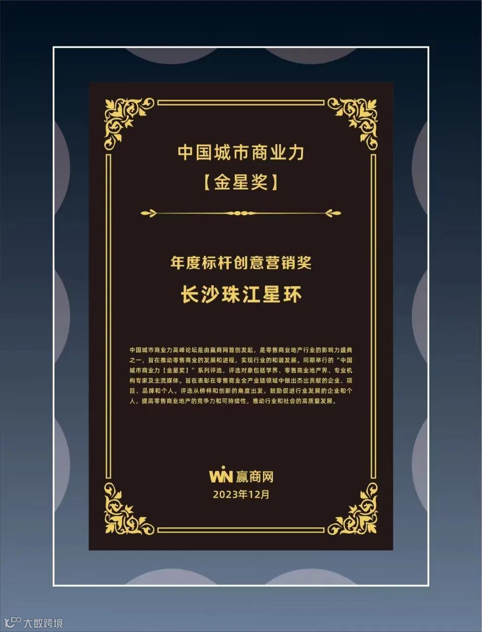 在本届举办的“中国城市商业力金星奖”系列评选中,珠江星环·长沙项目凭借其独特的商业模式、创新的经营理念和卓越的市场表现,在一众筹开商业项目中脱颖而出,一举斩获年度标杆创意营销奖。珠江·星环长沙项目作为蓄势多年的商业新作,倾注了珠江商管的心血与热忱。这一荣誉不仅是珠江商管长沙分公司工作锐意进取、砥砺奋进的肯定,更是对其未来发展潜力的无限期许,更体现了其对城市商业发展的深刻理解和精准把握。