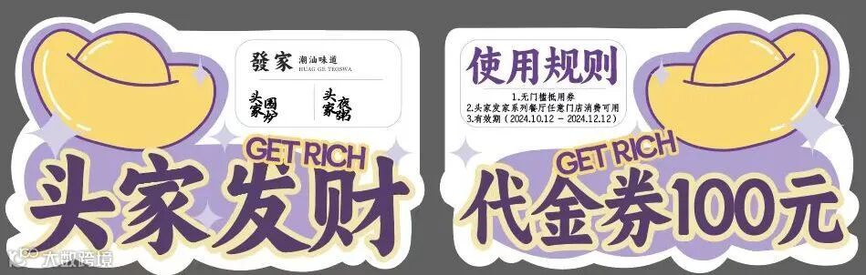 集齐“發發發”三个印章即可赠送100元无门槛代金券,可在发家·潮汕味道、头家夜粥、头家围炉三家门店使用。