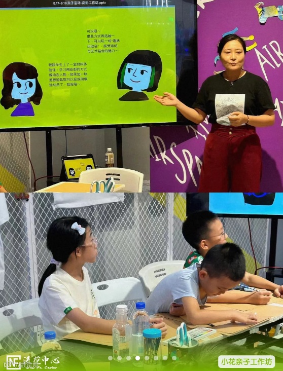 在烈日高温的白天,躲进空调房吹冷风还能增长知识,成为家长们暑期遛娃的好去处。流花中心以“艺术+研学”为主题,推出了“小花亲子艺术计划”社群活动——广州滑板艺术家周文:头盔艺术工作坊,52TOYS首席玩具设计师X2R:AI创作分享会,艺术学博士及佛山狮涵文化艺术总监叶剑光:文创有“钱”途·沙龙,广美艺术毕业生Taco:社会人自救图鉴手绘日记沙龙,美兮艺术工作室创办人及法国视觉传播硕士冰冰:皮影工作坊,嘚嘚地儿童剧团的戏剧体验……许多家长和孩子在灯光下安静地即兴创作,通过暑假与孩子一同成长,感悟艺术的魅力。