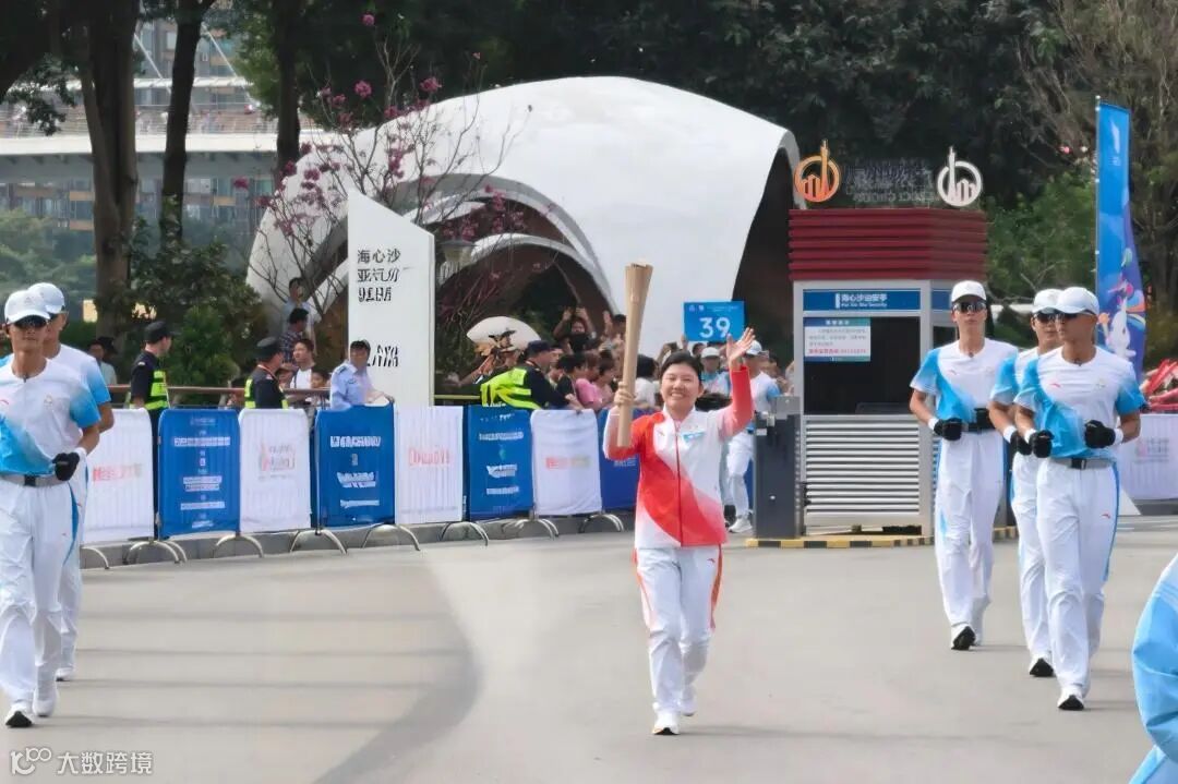 上午11点左右,第39棒火炬手林晓玲从四号桥跑入海心沙亚运公园。她步伐坚定、笑容明亮,一路向前。