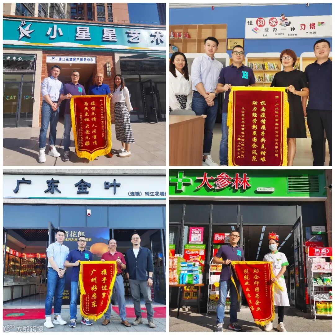 10月14日下午,珠江·星聚社(珠江花城)天河区图书馆茵德分馆、大参林、里享时光、小星星艺术教育及广东金叶五家租户为珠江商管准备了答谢锦旗,每幅锦旗充满着租户对珠江商管在战疫期间,积极践行社会责任、与租户共患难的敬佩与感激之情。珠江商管党总支委员、副总经理陈杰忠代表珠江商管分别走访五家租户并接受答谢,另外还与租户进行深入沟通交流。