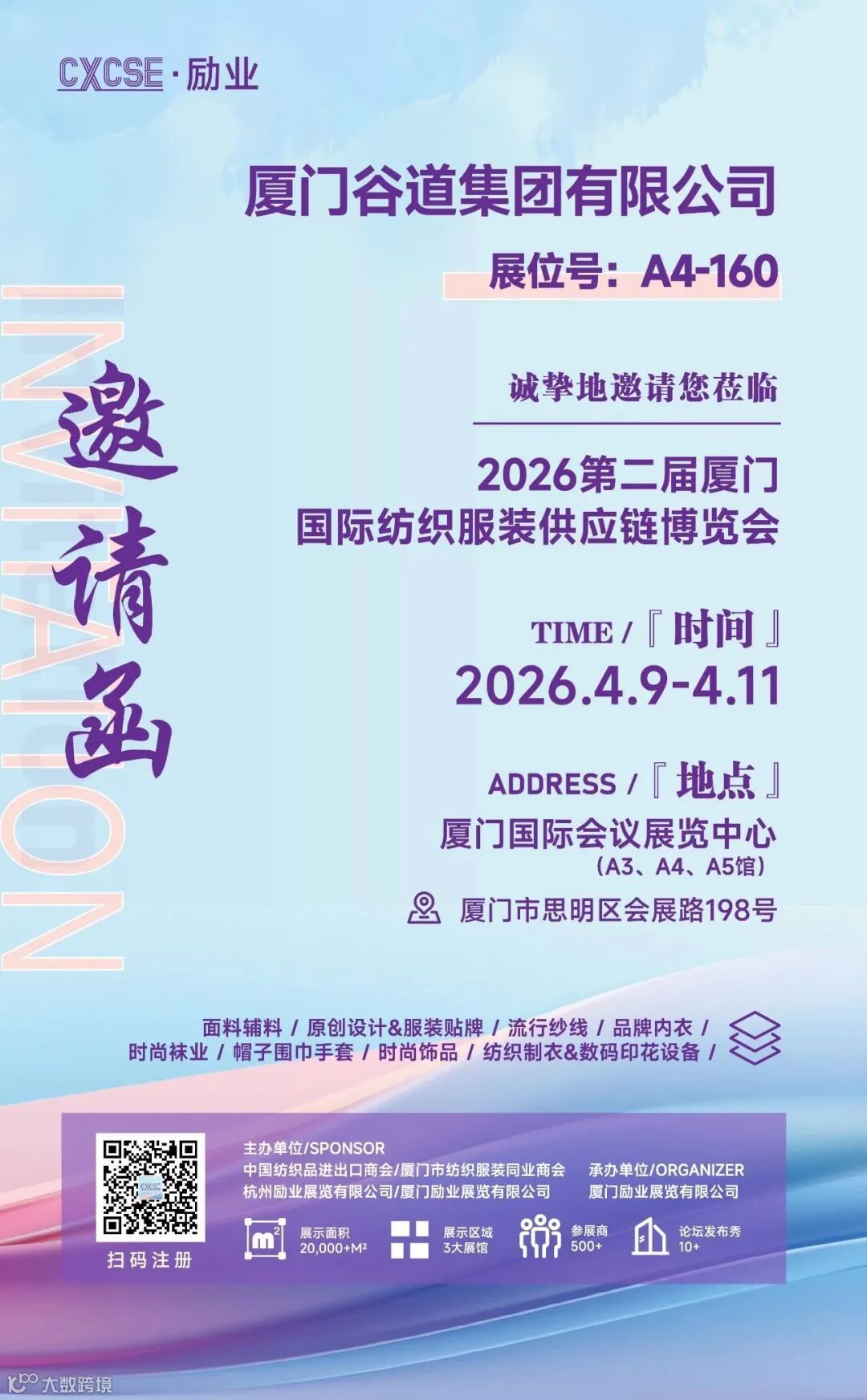2026厦门国际纺织服装供应链博览会将持续至4月11日,外贸牛展位位于A4-160区域,纺织企业可前往咨询合作事宜。
