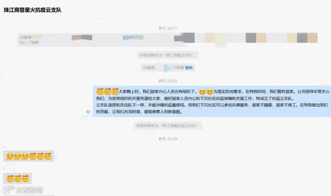 近期受疫情影响,广州白云区、海珠区、荔湾区等部分区域实行管控封控管理,当前珠江商管45名职工需配合属地街道做好居家健康监测工作。为积极响应集团党委疫情防控工作部署,珠江商管党总支结合实际情况,于2022年11月8日,成立星火抗疫云支队,由封控居家的公司党总支委员、副总经理潘晓军担任队长,号召全体居家办公人员“云”参与进来,让爱在云端抗疫中续航。