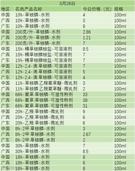 📊 3 月 26 日草铵膦系列产品零售价(100ml)