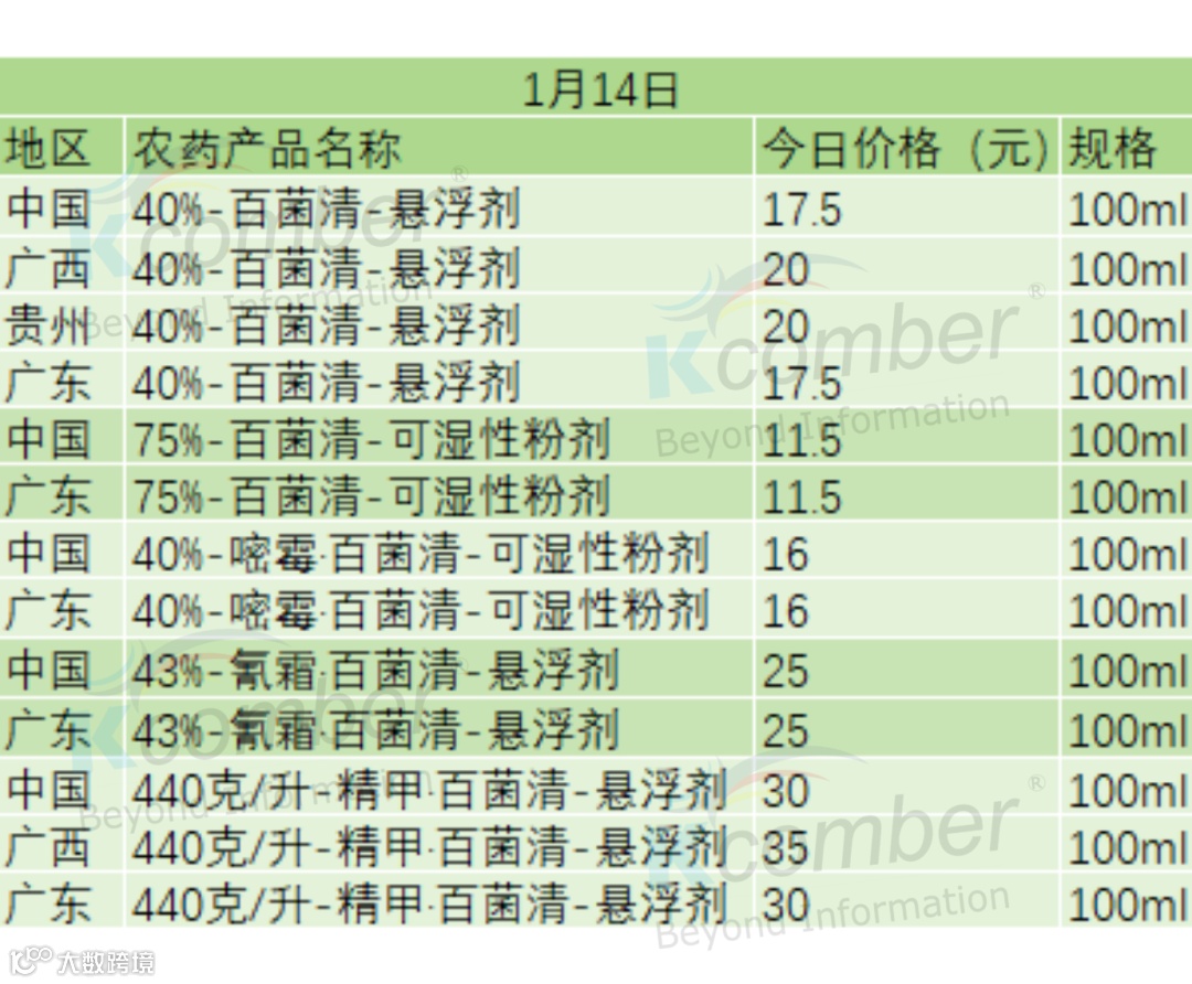📅 1月14日百菌清类农药零售价(100ml规格)