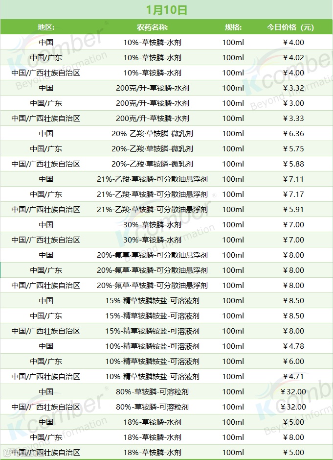 📅 1 月 10 日草铵膦类农药零售价(100ml 规格)