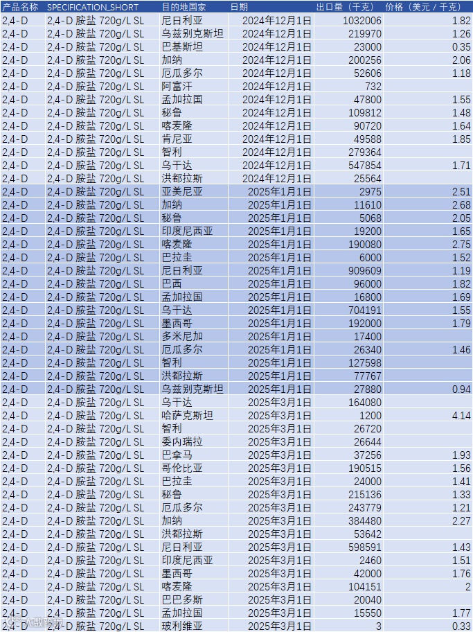 从数据记录来看,2,4-D 胺盐 720 g/L SL 的出口订单主要集中在非洲和拉美市场,同时亚洲和中亚市场也有一定分布。