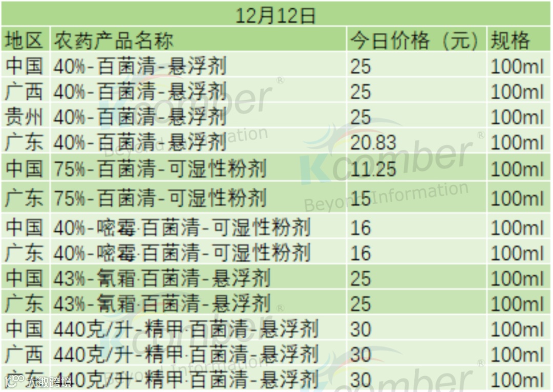 📅 12 月 12 日百菌清类农药零售价(100ml 规格)