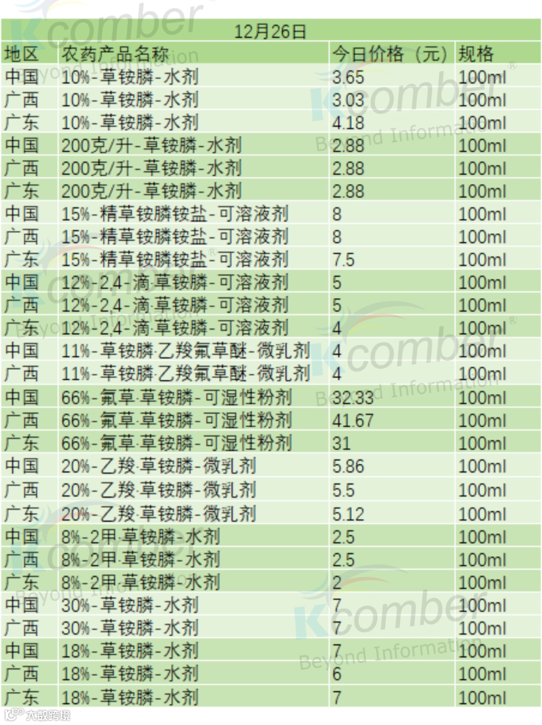 📅 12 月 26 日草铵膦类农药零售价(100ml 规格)