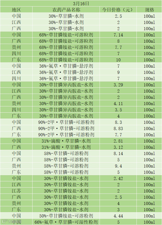 📅 3 月 16 日草甘膦类农药零售价(100ml 规格)