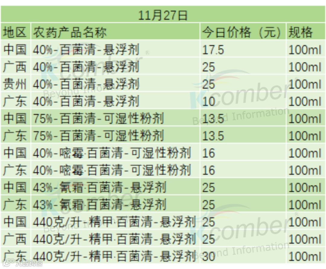 📌 11 月 27 日 · 百菌清系列产品今日价格汇总