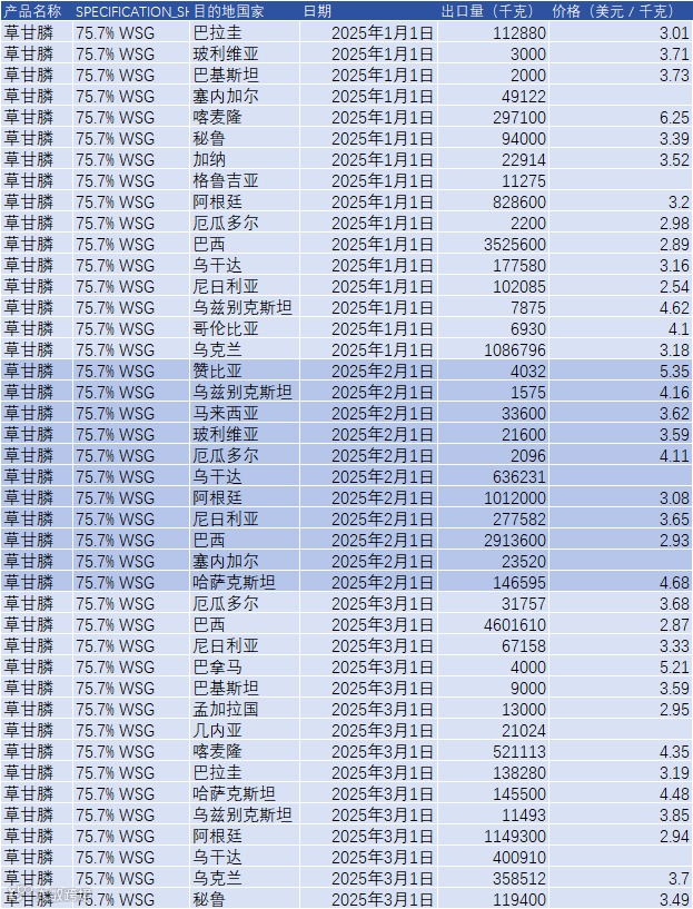从 2025年1月至3月 的出口记录来看,草甘膦 75.7% WSG 的订单主要集中在拉美、非洲及部分中亚市场,其中巴西、阿根廷等拉美国家保持较高采购规模,非洲和中亚市场也持续出现稳定订单。