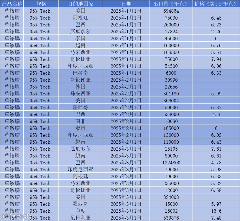2025 年第一季度,全球农化市场格局持续演变,草铵膦作为重要的非选择性除草剂,其出口表现成为行业关注的焦点。以下是基于详实数据的深度解读: