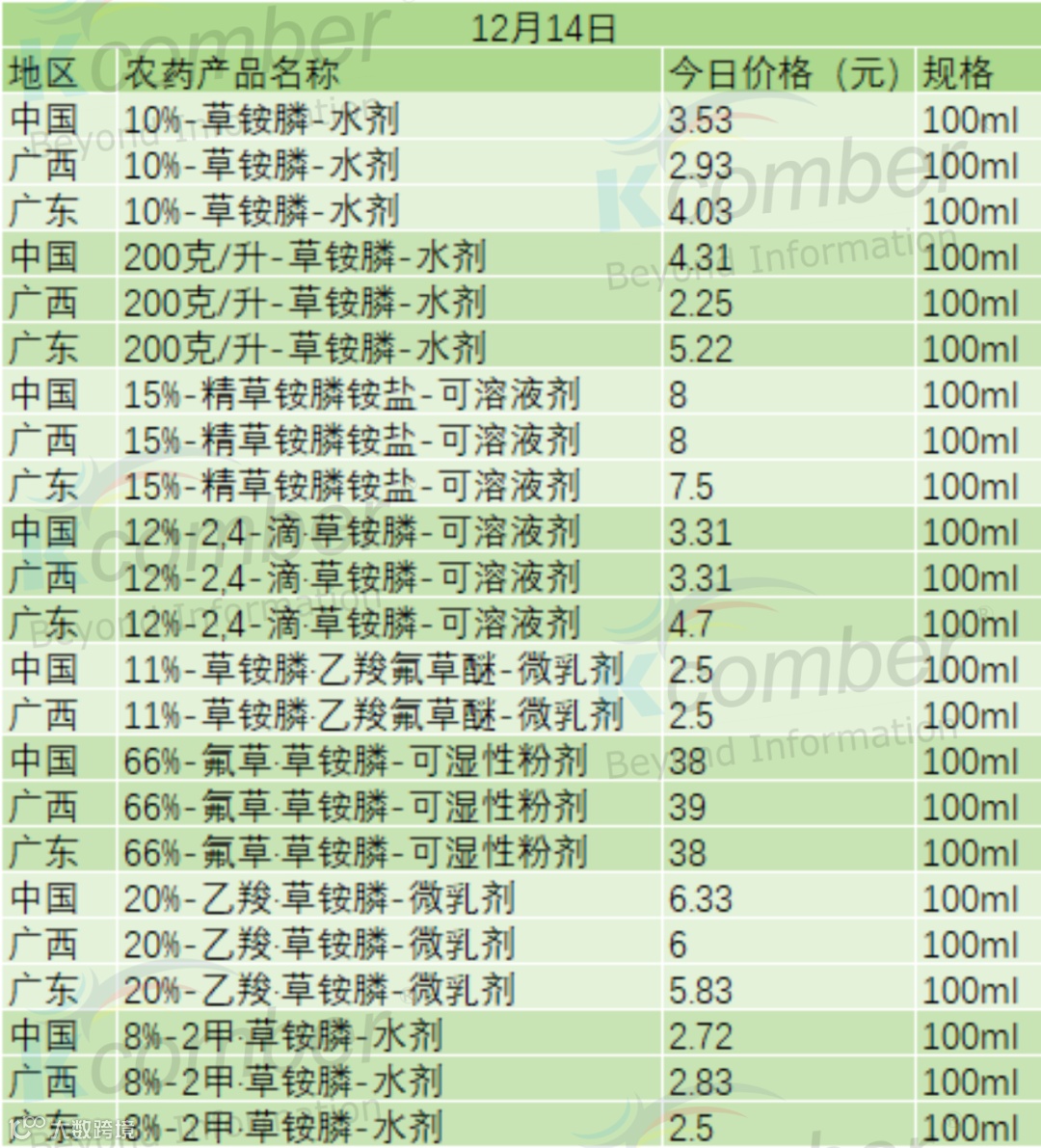 📅 12 月 14 日草铵膦类农药零售价(100ml 规格)