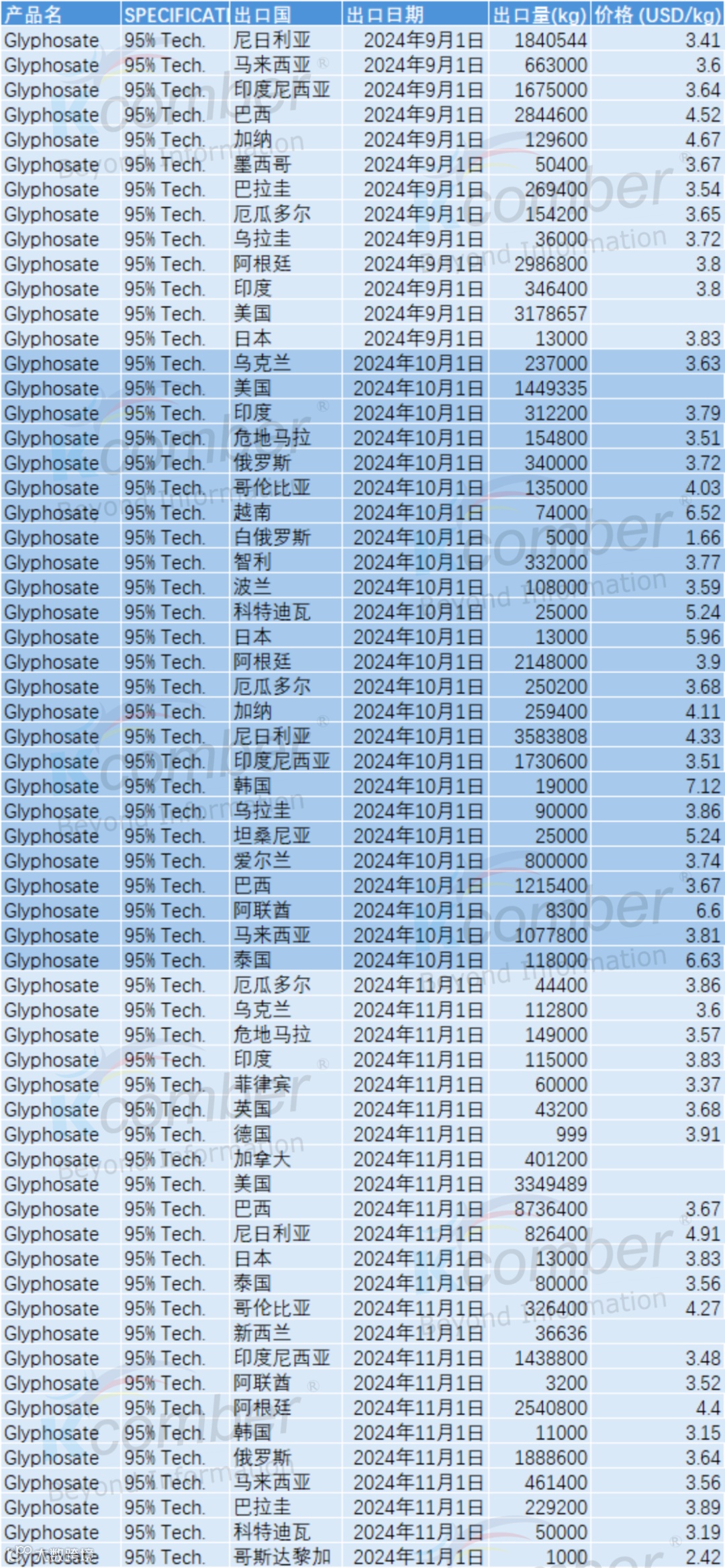 24年 9–11 月草甘膦 95% 原药出口主要集中于 巴西、阿根廷、美国、尼日利亚、印度尼西亚等核心市场。