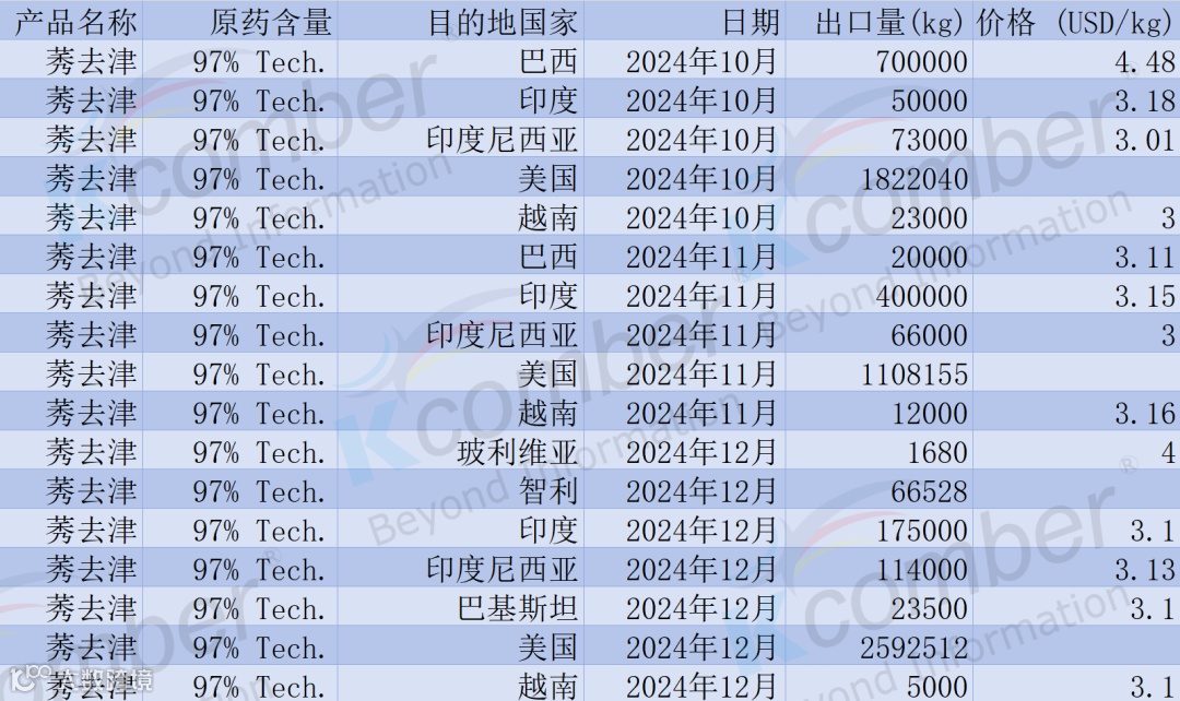 出口数据|Diquat敌草快2024年10-12月:核心出口国量价数据透视