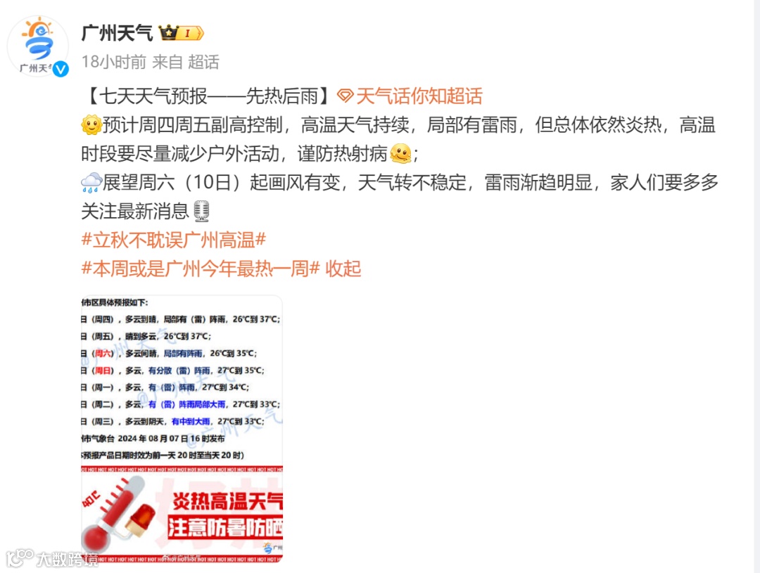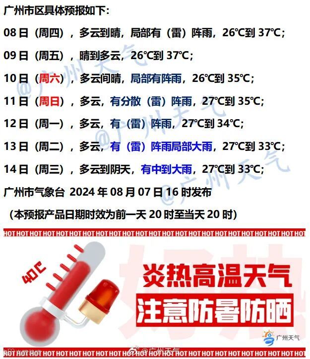 据@广州天气,在副热带高压下带来的高温之下,热力持续来袭,预计本周或是广州今年最热一周