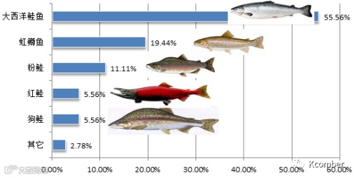 图1. 截至到2020年6月,全球各种三文鱼产量占比