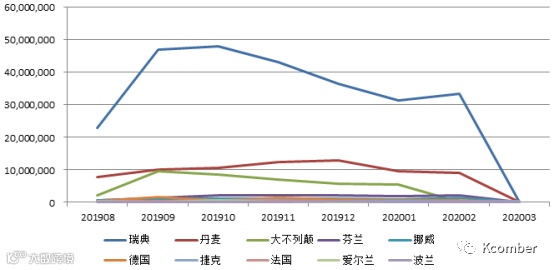 图3. 2019年8月-2020年3月欧洲地区三文鱼出口主要国家出口量,单位:千克