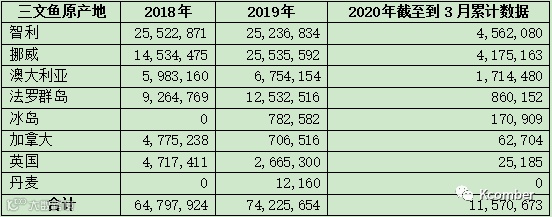 表3. 2018年-2020年国外三文鱼进口中国数量,单位:千克