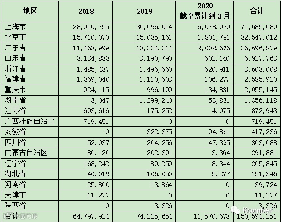 表2. 2018年-2020年中国各港口进口三文鱼数量,单位:千克