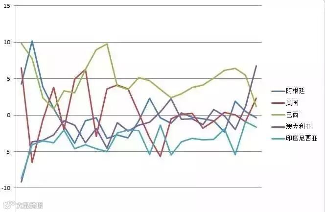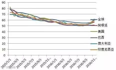 图3:2015年~2016年11月,中国草甘膦前五大出口国价格指数与全球平均价格指数的对比(设定值为0)