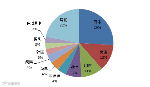 从出口总值看,2015年我国太阳能电池的主要出口目的国分别为日本、美国、印度、荷兰,出口总金额分别为:33.42亿美元、16.34亿美元、13.56亿美元、9.45亿美元。