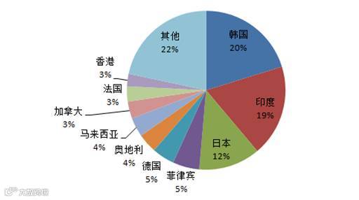 从出口总量看,2015年我国太阳能电池出口量最大的是韩国,占出口总量的20.18%。印度、日本分列第二、三位,分别占出口总量的18.7%及12.49%。而从出口的单价看,我国向美国、荷兰出口的太阳能电池平均价格分为126.19美元以及123.63美元,说明出口以整套组件为主;对日本出口的平均价格中等,为42.28美元;出口到印度的单价偏低,为11.47美元;而出口到韩国的单价仅2.96美元,说明出口以零部件为主。