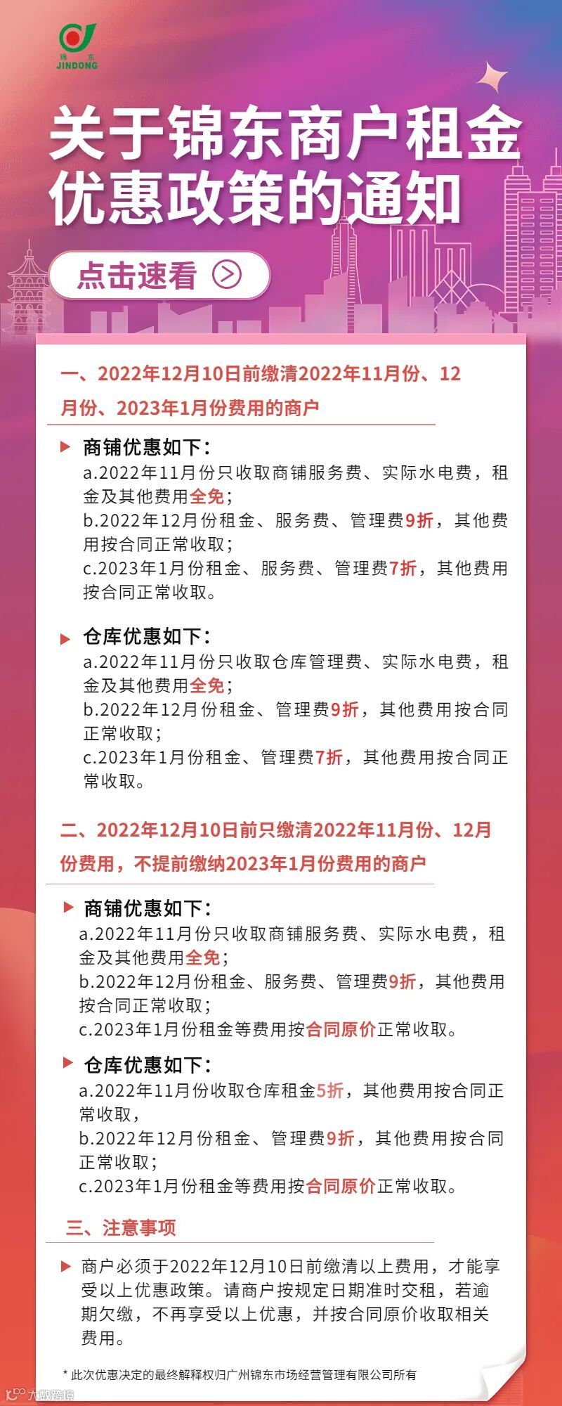疫情当下,全社会众志成城,锦东市场积极践行社会责任。现经本公司董事会决定,宣布推出《关于锦东商户租金优惠政策的通知》,给予锦东商户暖心优惠,略尽绵薄之力,同商户家人们携手共渡疫情难关。