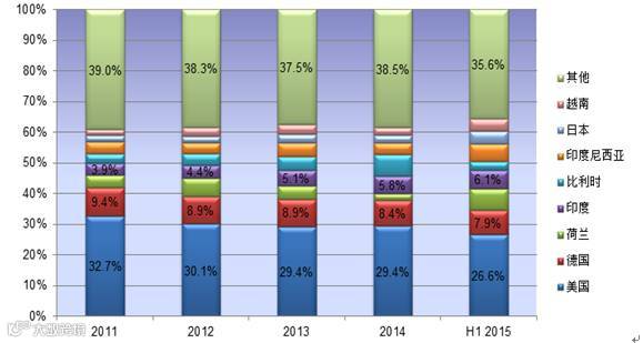 1. 美国依旧是最主要的出口国,但出口量所占比例在逐渐下降,而印度、越南及印度尼西亚等东南亚国家所占比例正在逐渐上涨。