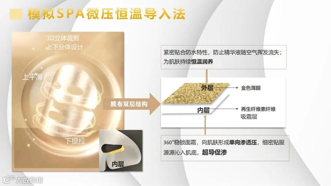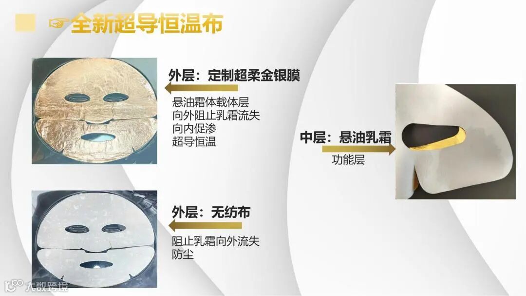 3D仿生人体工学裁剪 贴合各种脸型,紧密吸附贴合,高延展性、高舒适性。膜布将乳霜牢牢“锁”在膜布上