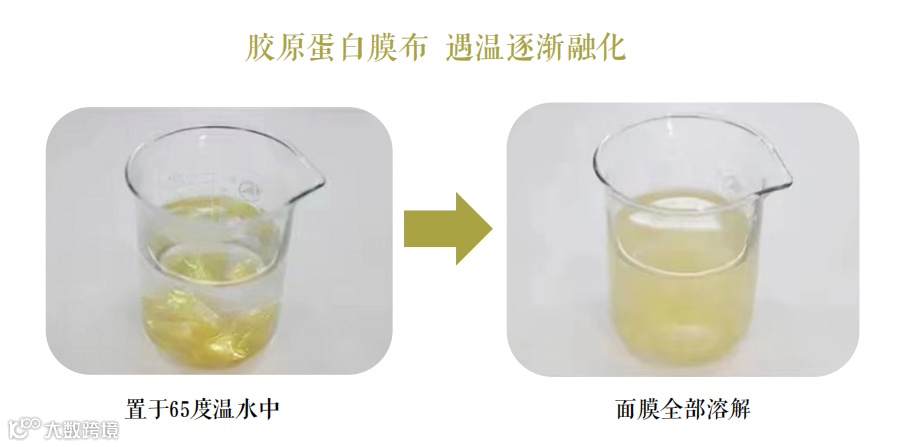 采用水溶性凝胶工艺,天然水凝胶科技工艺,浓缩更多胶原蛋白养肤,将面膜放入温水中搅拌,面膜可溶于水。