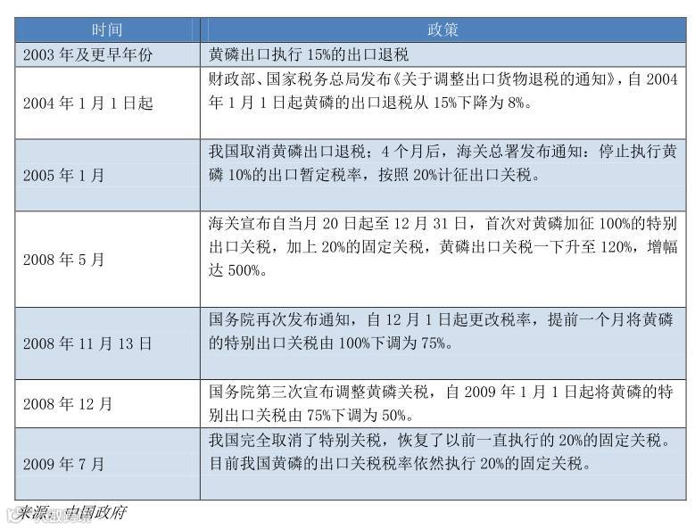 Tab1. 黄磷出口关税政策变化, 2003年–2009年7月