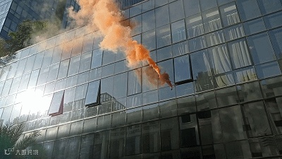 本次演练模拟祈福集团中心三楼大会堂发生火灾,报警组在外窗施放烟雾弹并触发感烟探测器及手动报警按钮。