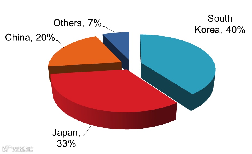 在2011年前的国际锂电市场,市场份额和核心科技一直为日韩两国所垄断。然而在中国锂电产业随后的迅猛追势下,这一局势在近年来发生了巨大变化,逐渐由日韩两大巨头,转变为中日韩三分天下的格局。日本市场占比正逐渐减少,韩国则超越了日本,成为了全球锂离子电池市场占比最大的国家。