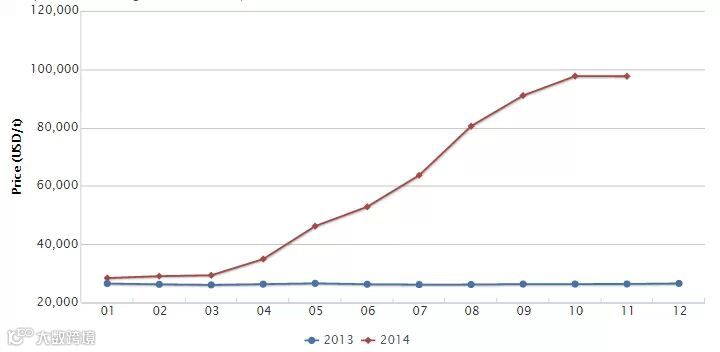 国内98%饲料级维生素B9的市场价格,2013年1月—2014年11月