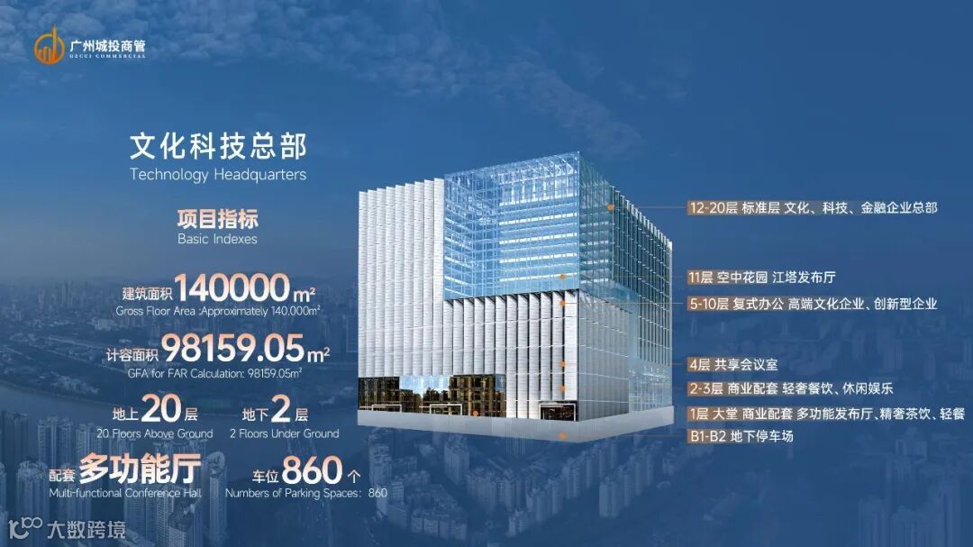 项目建筑面积约 14 万㎡,地上 20 层、地下 2 层,涵盖多功能国际会议厅、商业空间、共享办公空间、LOFT 办公空间、云端商业空间、标准写字楼、860 个停车位等建筑指标,位于广州新中轴线与珠江景观经济带交汇处,坐拥城市新中轴一线江景,毗邻赤岗领事馆、省级经济开发区,集聚文化科技金融企业总部,区位与交通优势明显,周边环绕财富、海心沙码头、多国领事馆、市博物馆、科学馆、艺术博物馆等文商旅全维经济资源。办公楼层空间满足 150㎡到 4650㎡多样化需求,使用率高达 74%,另有 8 套 1690㎡至 3380㎡超现代稀有 LOFT 精英办公独享空间,且项目配备 2.1 万方商业空间,具备明火及餐饮条件,11 层云端商业空间还设有 50 米超高灵动花园,可将广州塔景观尽收眼底。