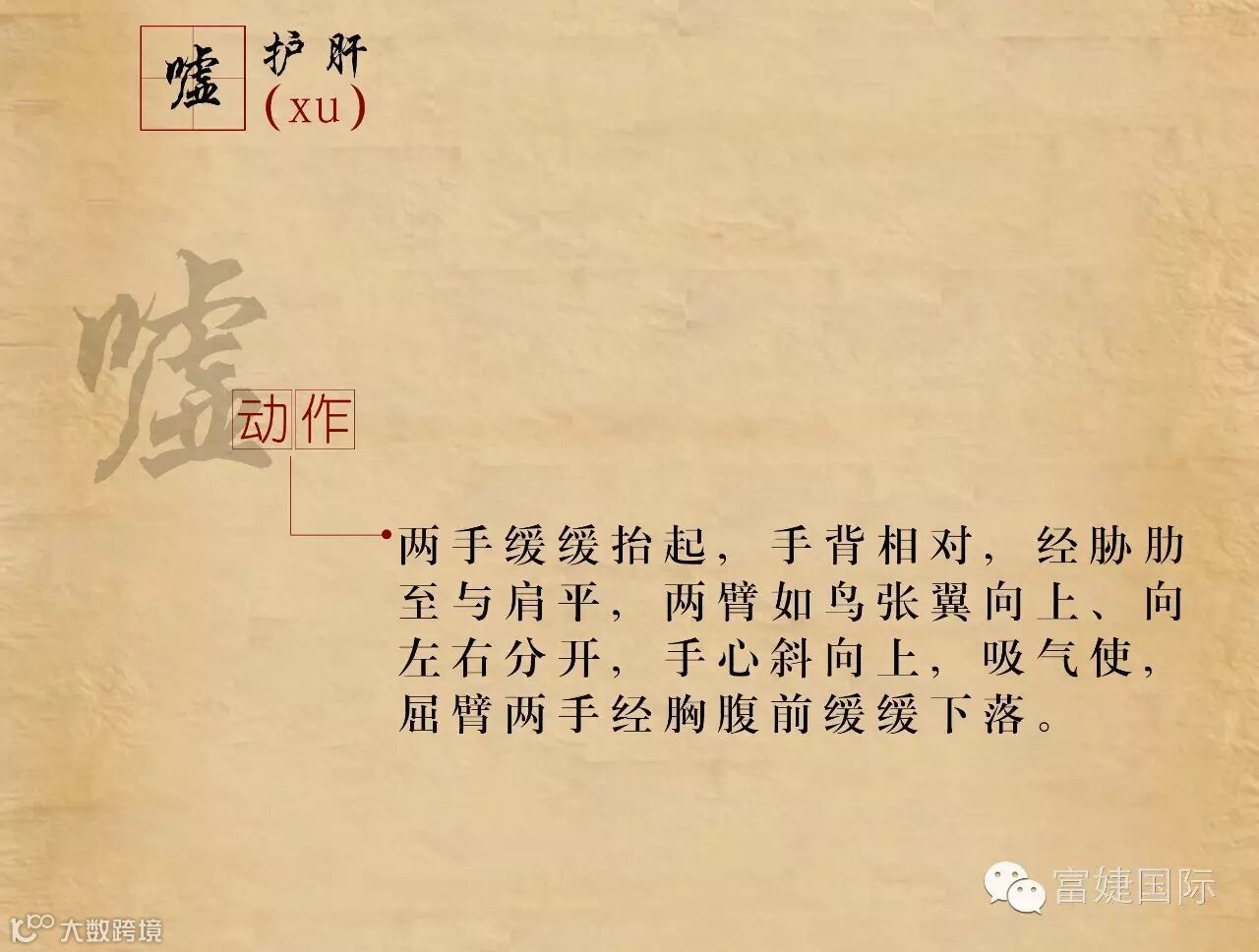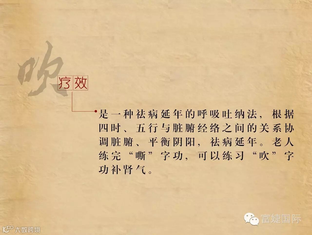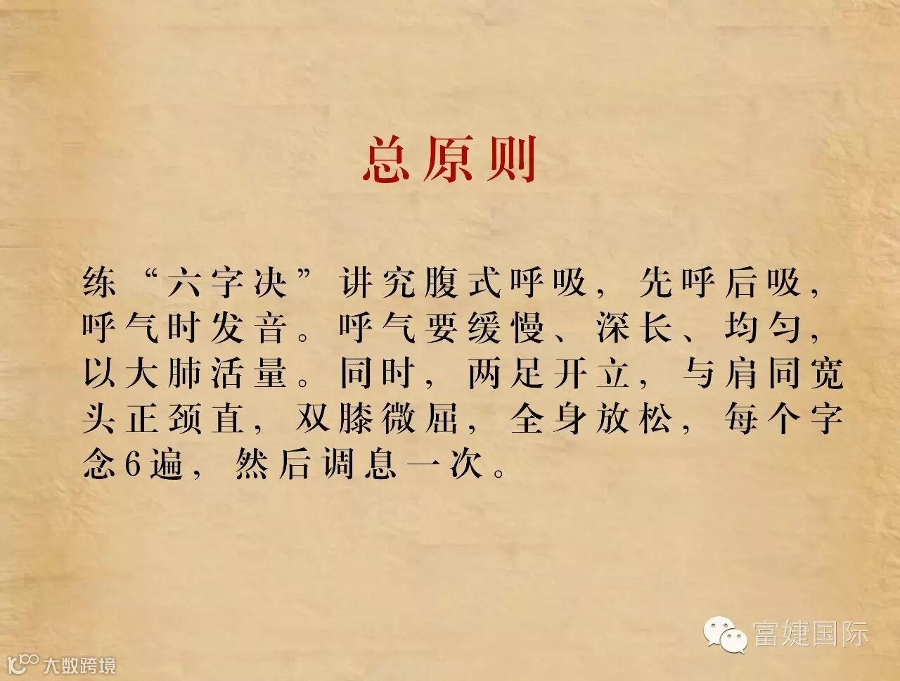 六字诀是我国古代流传下来的一种吐纳类功法。据考,该功法最早的文字记载见于《尚书》。具体的操作方法始见于南北朝陶弘景的《养性延命录》:“纳气有一,吐气六。纳气者谓吸也,吐气者谓吹、呼、唏、呵、嘘、皆吐气也。”自隋以来,历代文献对六字诀有不少论述,例如孙思邈的《千金方》、汪昂的《医方集解》、龚廷贤的《寿世保元》、冷谦的《妙龄修旨》。明代冷谦的《修龄要旨》把六字按照五脏的关系与四季配属起来:“春嘘明目木扶肝,夏至呵心火自闲,秋呬定收金肺润,肾吹唯要坎中安,三焦嘻却除烦热,四季长呼脾化餐,切忌出声闻口耳,其功尤胜保神丹。”拓展了其应用范畴。