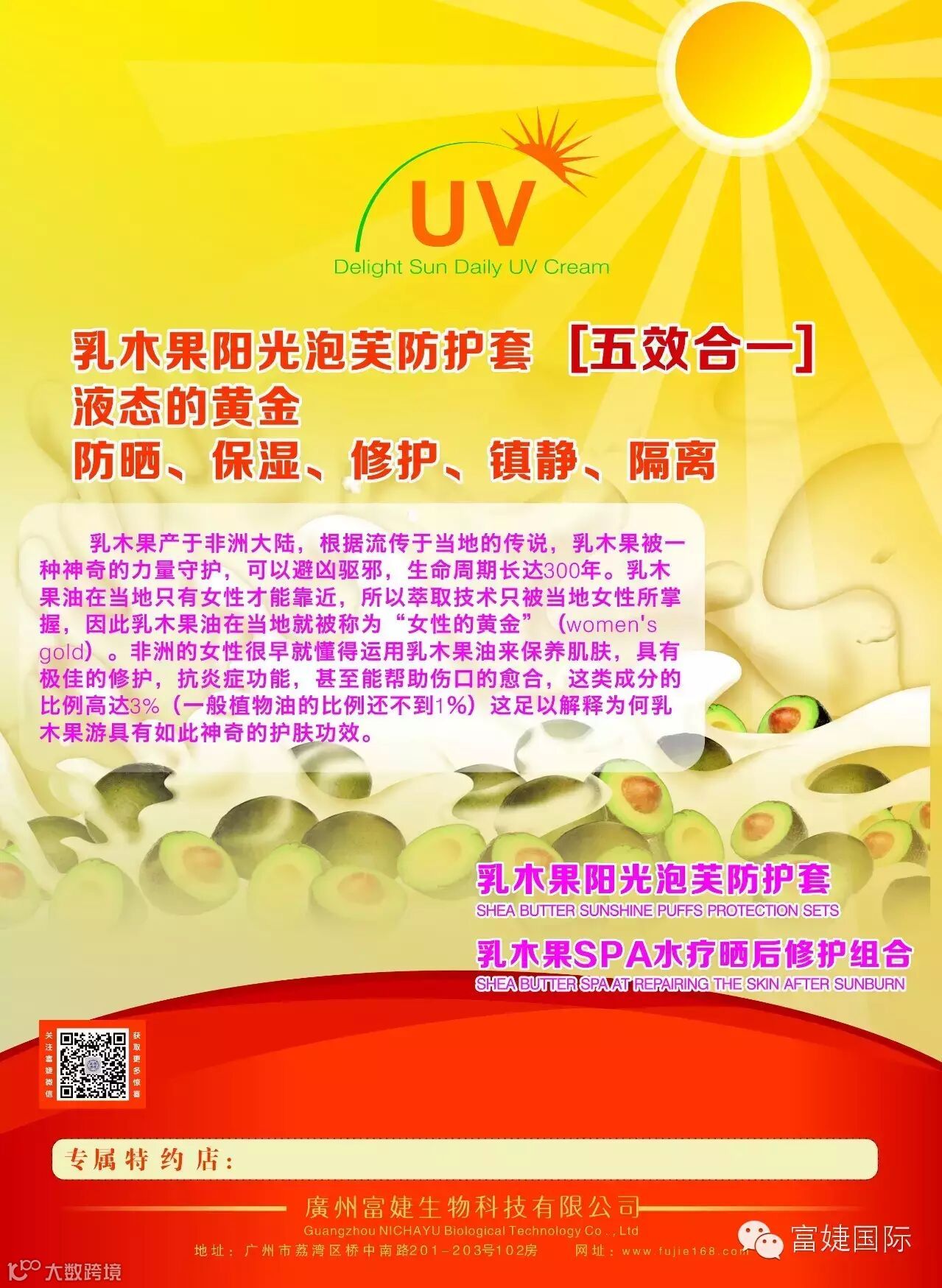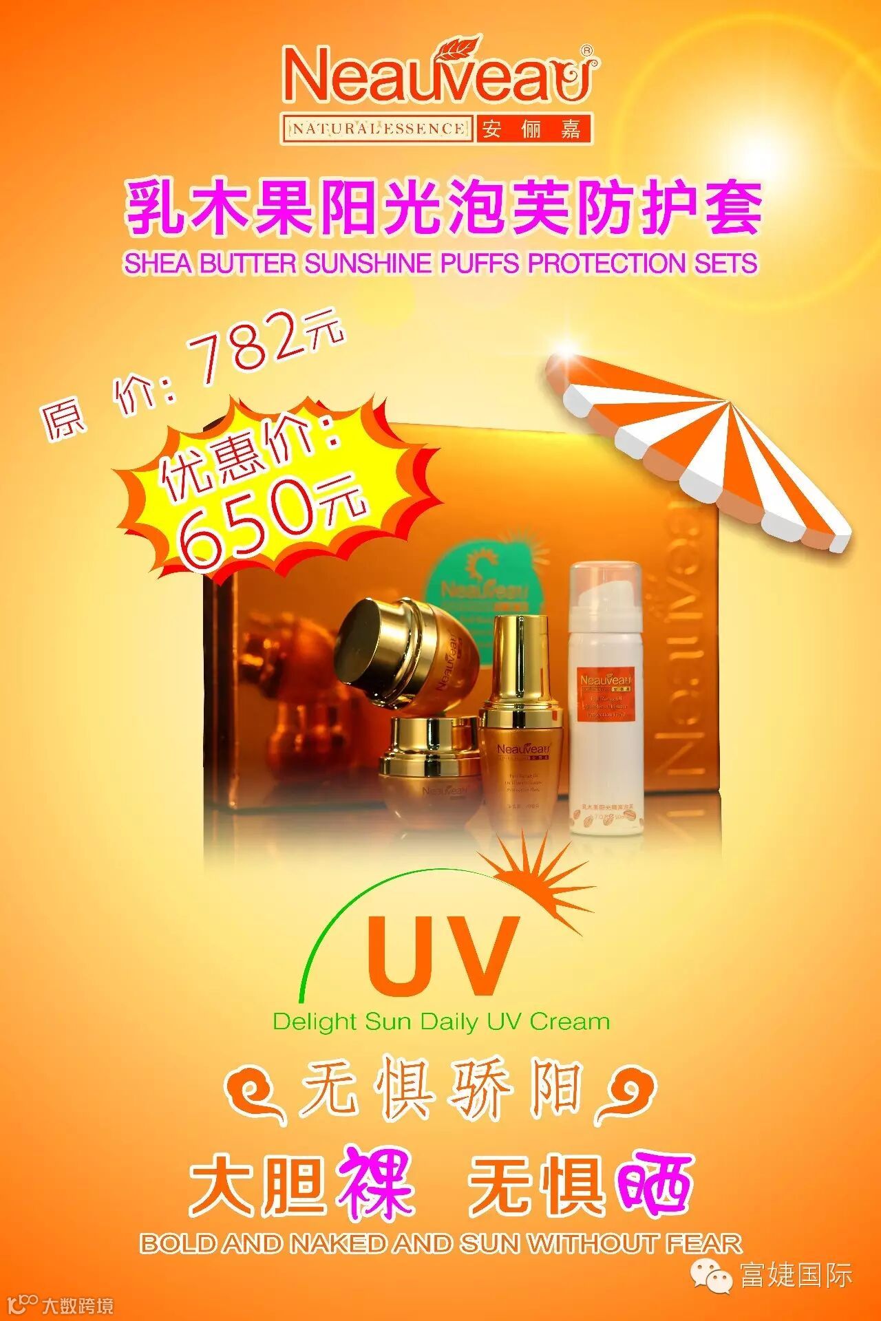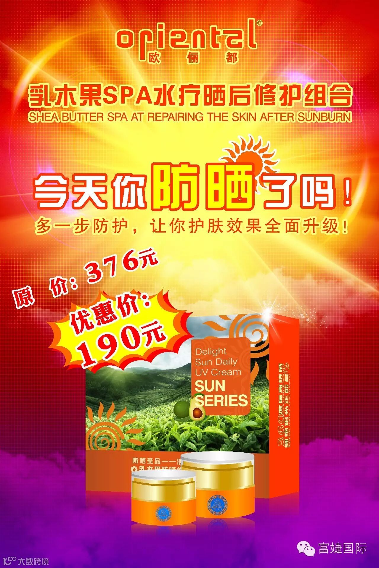 富婕生物科技女人不防晒,肯定老得快现在不用防晒霜,日后必用祛斑霜 您买或不买防晒,您用或不用防晒,阳光都在那里您信或不信防晒,品质就在那里你爱或不爱防晒,防护就在那里研究表明,下暴晒10分钟,提前衰老 3天,所以一定要做好防晒,不单单防晒还对空气污染和电子辐射也要隔离,才能更好的保护我们的皮肤!!!!!